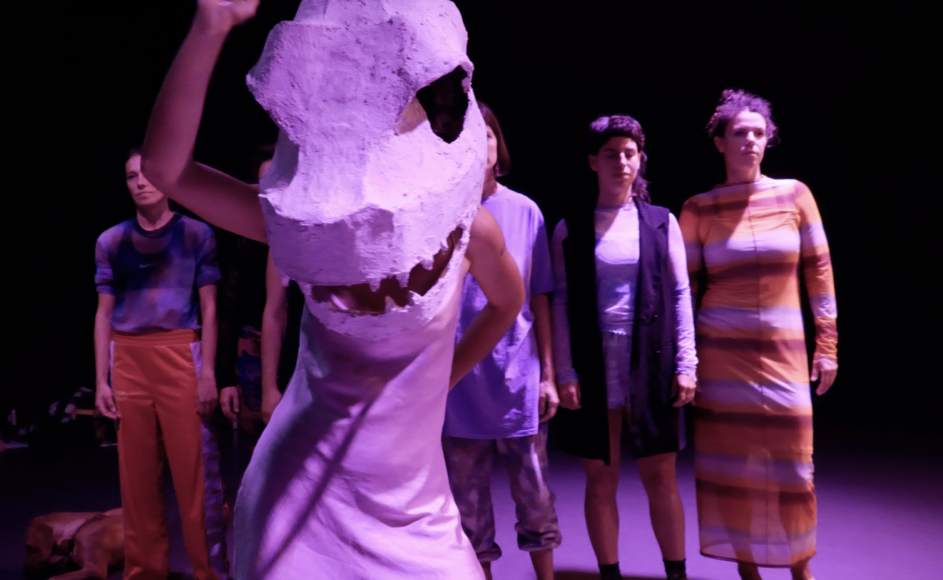 Il est question d’origine, de refonte. Quitter la nostalgie et penser l’héritage par le biais de la transformation. Il y a donc des trajectoires pour nécessiter ce mouvement, sous forme de courses poursuites et de quêtes personnelles et collectives. 17 tableaux performés par neuf meufs incarnent notre scénario, qui tente de renverser les stéréotypes de l’imaginaire collectif et les tropes cinématographiques qui nous encombrent. Promis ce n’est pas absurde. C’est un peu surnaturel, un brin fantastique, un peu camp, un peu épique, un peu pop, bizarre et horrifique. Mais surtout c’est poétchique et subversif. C’est un peu réflexif comme toujours dans Celui qui dit qui est. Il y a des références à l’histoire de l’art, aux héros et héroïnes de cinéma, à l’univers internet. Les pratiques se mêlent entre le jeu, la danse et la musique live. On dit fausse comédie musicale parce que c’est la troupe Celui qui dit qui est qui se prête au jeu de ce genre. Avec des voix et des corps qui ne sont pas exactement calibrés pour ça. On laisse la place à du cabossé, du brut, du naïf qui se fond dans un tout sensoriel qui parfois est performé avec brio. La musique live se qualifie comme electro poétique garage et s’accompagne de chant amplifié et non amplifié. La polyphonie présente dans le son est plus largement une notion centrale de notre langage; la destructuration d’une seule et même voix, l’ornementation des voix secondaires, l’entrelacement de ritournelles sont aussi au coeur de la danse. Notre transdiciplinarité est totale, chaque langage scénique prend autant de place que l’autre. Aussi, sous le principe de deterritorialisation ou d’emprunt de regard, nous transposons des démarches d’autres arts à ceux que nous pratiquons. Le free jazz inspire notre manière de trouver théâtre, le found foutage notre manière de faire récit, la composition chorégraphique s’inspire de l’architecture des chants traditionnels corses… Il y a des incrustations vidéo et photo qui ont été tournées dans la ville où on joue. Pour faire rentrer le dehors au dedans et troubler la lisière entre réel / fiction, salle / espace public, projection personnelle / collective des spectateurices et pour casser la tête avec des jeux de boucles temporelles à la Lynch & son donut. Dans un tout baroque, nous cherchons l’énergie au fond des corps qui met en branle la métamorphose pour générer des sensations vivantes face à l’immuable.