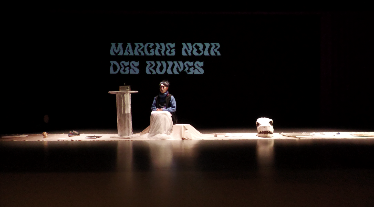 C’est quelques temps après une catastrophe. Le décor c’est ville nouvelle à l’architecture égratignée par le temps. Des guérillères s’extraient des ruines pour refonder une société. Un trio de déesses a pris le pouvoir. Pendant ce temps des dealeuses ouvrent un marché noir aux ruines pour recueillir des fonds pour les associations de nostalgiques. Porteurs du vieux mondes, deux détectives tentent de capturer la première des femmes, Déva Prima Pandora, un alter égo de notre sacrée Eve qui prend la forme tour à tour d’une motarde vengeuse déchainée sur le périf, d’une extra terrestre et sa chienne sniffeuse, d’une héroïne déguisée en clown d’anniversaire. Une guérillère s’invente la dernière des femmes et entame un kuduro des ruines sans fin. Deux kutzu plantées au balcon de la tour Vermeille sont témoins de ce bal de créatures. Elles cachent chez elle une militante insulaire en cavale qui révèlera l’entrechassé de tous ces destins.